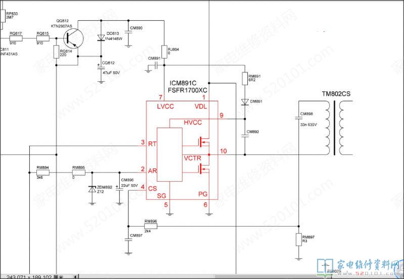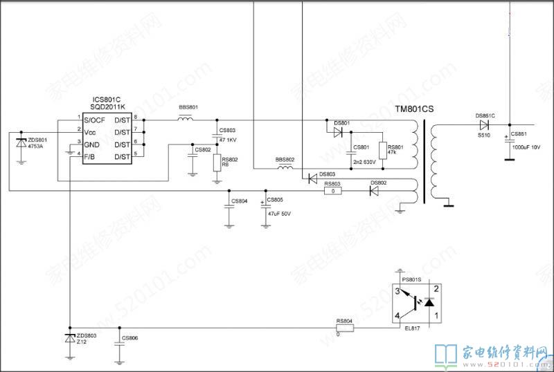 第二,测副电源5v和PFC400v。副电源电路简单而且很少出现问题,如果5v和400v都正常,那么果断换掉主电源IC(FSFR1700XC),基本就可以修复。如果PFC没有工作,测副电源开关变压器给主电源及PFC的IC供电电压,由TM801CS低压绕组一路经DS802;CS805给副电源IC (SKD2011)供电,另一路经DS503整流后CQ815滤波得到15v电压经控制管QQ811供给主电源及PFC的IC。电压过低可判定后级IC损坏。拆掉主电源IC(FSFR1700XC),如果供电电压恢复正常15v,这时可以检测pfc电压,没有则说明主电源IC击穿的同时要同时烧掉了PFC电源芯片(FA5695)。