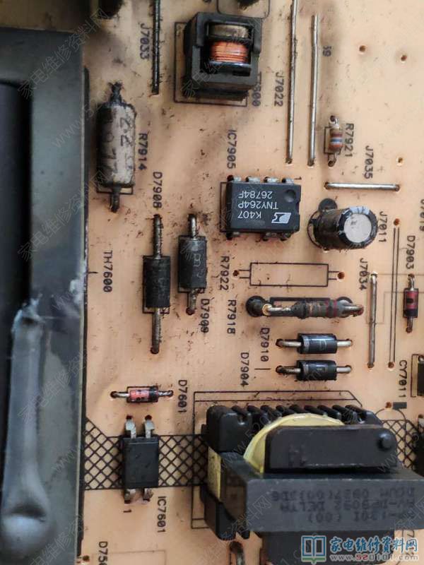 把电视送用户家安装好,结果电视机十分钟左右关机,关机后红灯也没有,结果拿回维修部开盖试机,电视机又不出现故障,由于我怀疑待机5V出现故障,当我手触及图片TNY364发现非常烫手,估计是芯片发热待机电源保护了,因为我修好那几天气温不高,所以未出现故障。现在我分析这机器原来故障就是该芯片发烫,由于芯片反复强盗关机,最后让主板有个程序错乱,后来出现上次有规律37秒关机的现象。当然我换了芯片,芯片也不烫了,电视机装上后盖无论多久也不出现故障了。