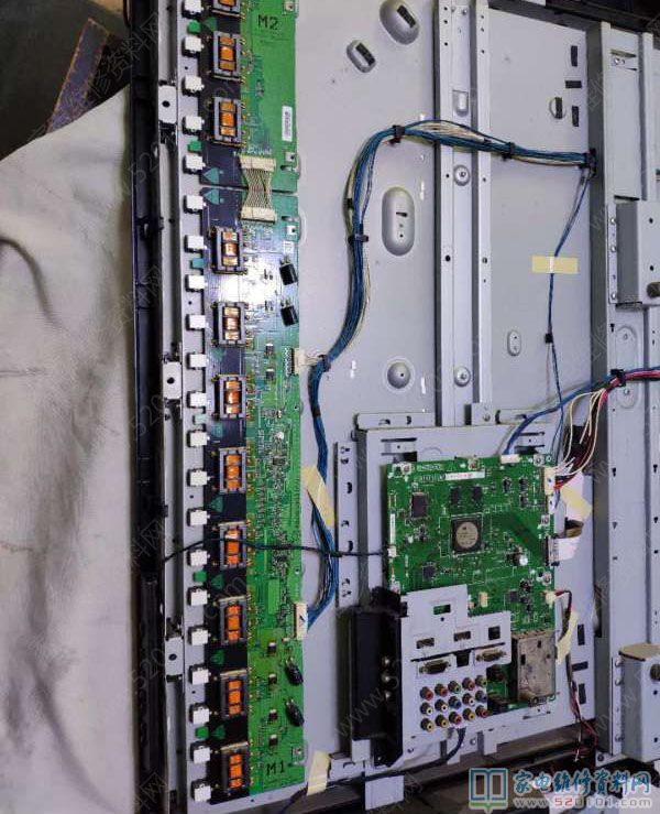 于是转移到主板到高压板控制线检测,当我去掉高压板供电线后电视机虽然不亮,不过这个时候电视机一直不保护且一直声音正常,看来故障原因出现在高压板部分。这时候发现主板到高压板有三根控制线,通过分析三根线,有两根应该是背光点亮和背光亮度控制,有一根应该就是高压板工作是否正常检测线,这根线当我断开高压板供电时候,主板一边一直为3V,接入高压板供电,当高压板点亮后就变成0V(这点电压到底是否正常还要高手分析),于是我就断开图片插件这根线,电视机一直正常,还有就是本来不断开这根线电视机工作正常那几十秒背光有亮暗变化现象,断开后就没有了,这个现象有人在求助过程中也描述过,这点对和错也要高手指点。由于我断开这根线后电视机好了,还有我测试过高压板每一一个变压器阻值都正常,刚开始觉得应该不会出大的问题,再说高压板自身还有保护电路。