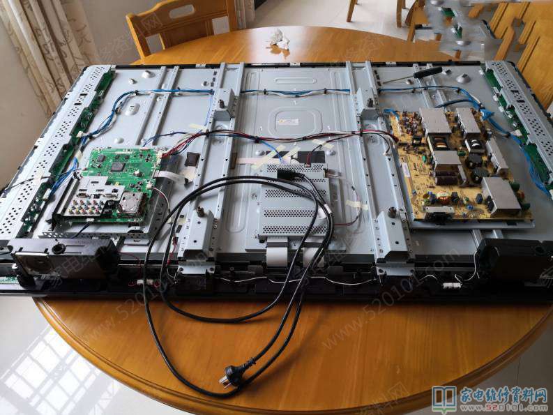 接修一台夏普LCD-60E77A液晶电视,故障表现为指示灯绿3秒变红,首先拆机,拔下电源板上所有连接插头,然后短接bu5v、ps-on两针脚,测量两组24伏输出是否正常,这台机器是正常的,排除了电源板故障。