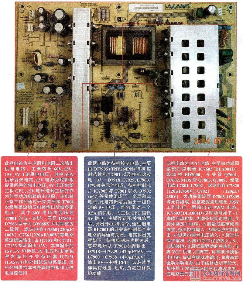 该机电源部分由两块板组成,由于功耗大,EMI防护与滤波电路 单独制作了一块电路板,这样滤波效果更好,电源滤波电路更能承受高压谐波的冲击。说是进口机型,其实都由中国电源厂家代工生产,与传统电源没有什么太大区别,都由主电路和副电路构成,同样用继电器来控制开/关机;所不同的是输出的电压组数较 多,一组68V电源为高压背光板供电,具体如下图所示。