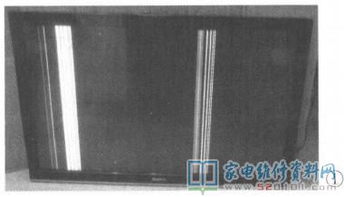 例1:一台索尼KLV-46BX450型液晶电视,开机后伴音正常,无屏显,无图像,屏的左侧和中间偏右的位置上有几根彩色竖条,如图1所示。