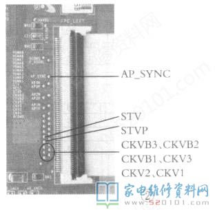 考虑到送到液晶屏的数据信号和控制信号异常也会出现本故障,因此还应对这些信号进行检查。该逻辑板送往液晶屏的数据信号和控制信号较多,除6对RSDS信号(包括AP1P/AP1N〜AP6P/AP6N)外,还有AP_SYNC、STV、STVP、CVK1~CVK3、CVKB1~CVKB3等控制信号,有关测试点如图2所示。