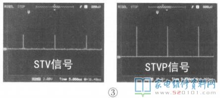 用示波器在测试点测量,发现AP_SYNC、STV信号的波形正常,但STVP点无信号波形。原来维修过很多的液晶彩电逻辑板电路,都没见过标注为“STVP”的信号,不知道其含义,上网查询,也没查到。单从英文符号来看,STVP信号应与STV信号有一定的联系。