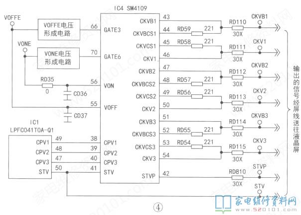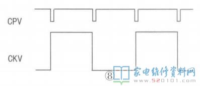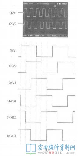SM4109内部电路在3个CPV信号的作用下,将VONE直流电压变换成6个CKV信号,分别从⑬、⑯、⑰、㉚、㉛、⑭脚输出,经屏线送到液晶屏±o⑭、⑮、⑱、⑲、融⑨脚是反馈端。CPV信号和CKV信号的关系如图8所示。