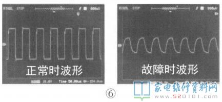接下来转入检查逻辑板输送到液晶屏的有关控制信号,包括AP_SYNC、STV、STVP、CKV1-CKV3.CKVB1〜CKVB3等信号。用示波器在测试点逐一测量,AP_SYNC,STV.STVP信号波形正常,而6个CKV信号中只有5个(CKV2、CKV3、CKVB1、CKVB2XKVB3)是正常的,正常波形为方波,幅度约35Vp-p,如图6所示。