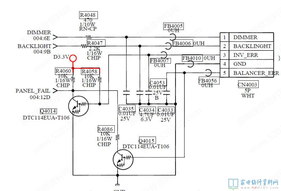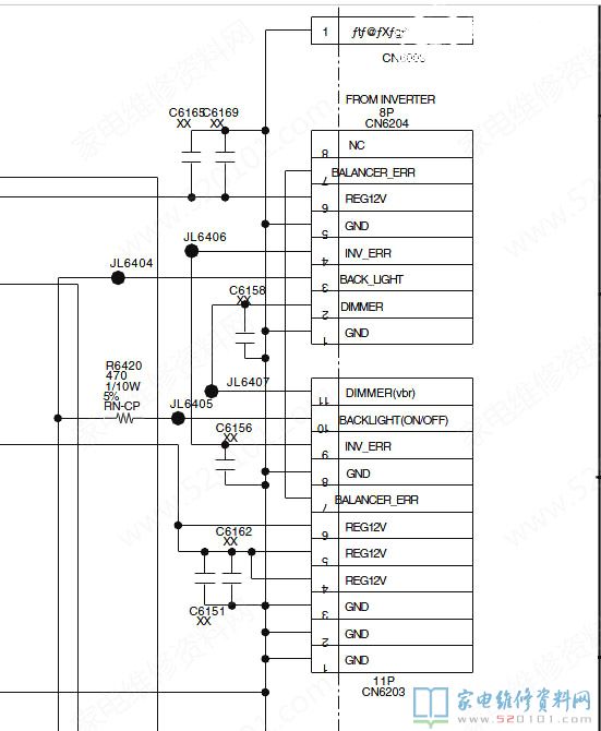 接修一台索尼KLV-40V300A的液晶电视,故障表现为开机屏幕不亮,伴音正常,大概几秒后就保护关机了,指示灯变红色,循环闪6次。拆机检查从主板过来的背光控制电压,测得CN6203(10)脚BACKLIGHT端电压为零,(7)脚BALANCER_ERR为零,(9)脚INV_ERR两个保护端电压为2V左右。分析电路得知,高压板要工作(10)脚电压应该至少为3V左右吧,而两个保护端电压应该为零吧。