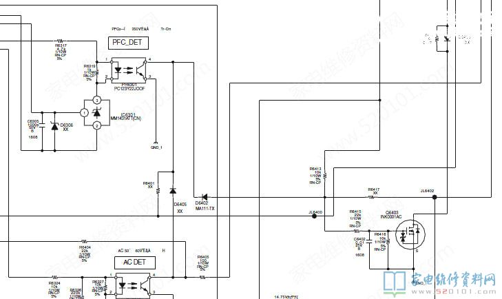 带着这个思路,首先检查电源板上有关(10)脚电压走向情况,从(10)脚出来经R6420后分两路,一路直接到主高压板了,另一路通过二极管R6418到场相应管Q6403了,该管子为PFC电压检测用的,当PFC电压异常时使其该管子导通后强行把(10)脚电压拉低来防止故障扩大。先试着断开该管子,开机测试(10)脚电压还是为零,测对地电阻为5K左右,应该是主板没有送电压过来。是不是主板检测到(9)脚电压异常而保护就不送出该控制电压呢?经查阅大量资料,更换高压主板上的低压控制电源模块IC6702(PQ200WNA1),机器恢复正常。