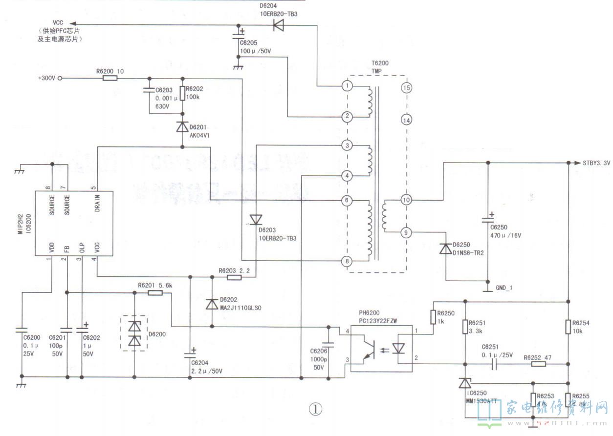 一台索尼KLV-46J400A型液晶电视,关机后再次开机,指示灯不亮,整机无反应。拆机,上 电测量电源板上STBY3.3V电压为0V;拔下电源板通往主板的连接线再测,电压仍为0V,由此判断故障在电源板上。该机电源板号为1-876-467-21, 且未设总电源开关,即上电后待机电源就输出3.3V (STBY3.3V), 并且AC-OFF-DET端也输出3.3V;二次开机后,主电源工作输出12V( REG12 )和15V( UNREG15V)。检查电源板上保险管F6001未断,其他元件也未见异常。该机待机电源芯片采用MIP2H2(IC6200),如图1所示。