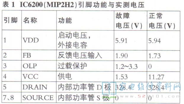 MIP2H2是一款小功率开关电源芯片,内含PWM控制器、700V大功率MOSFET开关管等电路,其引脚功能与实测电压见表1。