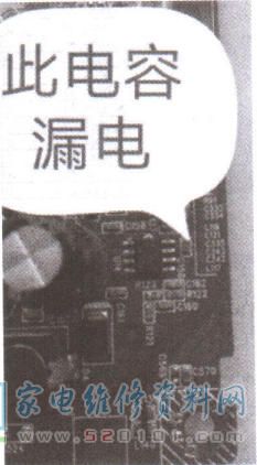 测量U14的②脚输入24V电压正常,但输出电压为0V,且12V负载没有短路现象。U14的⑦脚(EN,芯片工作与否的控制脚)是使能端,高电平时芯片工作。在本电路中,⑦脚是悬空的,在数字电路中空等效为高电平。难道U14坏了?断电,用指针万用表RX100挡测量U14各脚对地电阻(红笔按地),发现⑧脚(软启动端)阻值不稳定,在2k左右波动。该脚外围只有一只电容C156(起充电延时作用),用电烙铁加热C156,阻值有变化,最后稳定为6k,由此判断C156异常。拆下C156检测,发现已经漏电,如图3所示。更换C156后试机,故障排除。提示:C156为软启动延时电路。C156 漏电后,U14的⑧脚电压始终达不到启动阈值,故U14不工作,从而出现不开机故障。