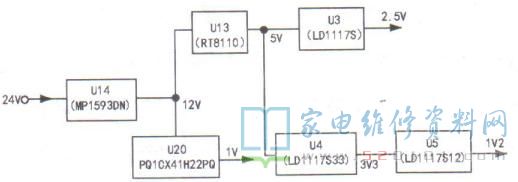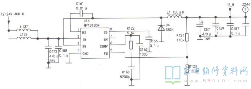 一台飞利浦47PFL3609/93 型液晶电视,上电后电源板.上的继电器有吸合声,但无图无声,背光不亮,遥控、键控失效。分析检修:继电器吸合,说明主板已向电源板发出了开机信号。测电源板输出的12V和24V电压都正常,但无背光BL-ON信号,供应逻辑板的上屏电压为0V,转向检查主板.上的各组供电。本机主板供电框图如图1所示,上电,测得以U14(MP1593DN )为中心的DC-DC电路输出电压为0V。U14及其外围元件组成的12V电压形成电路如图2所示。