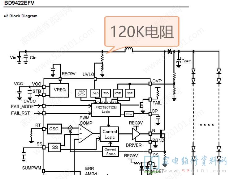 首先查阅到索尼42W650A不开机红灯闪6次故障是背光板不工作引起的,测量此背光板上背光输出接口电压正常时为42V,再次把损坏的120K电阻换上后再测输出接口电压为19.5V,与电源适配器输出电压一样。故判定为背光驱动集成电路不工作,此背光驱动集成电路型号是BD9422EFV,查阅此集成电路技术手册,得知损坏的120K电阻为BD9422EFV第39脚低电压检测脚的电压引入电阻,此电阻阻值变大或开路会导致39脚电压过低或者没有电压会引起芯片保护不工作,到此故障的原因真相大白。