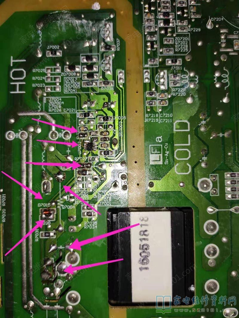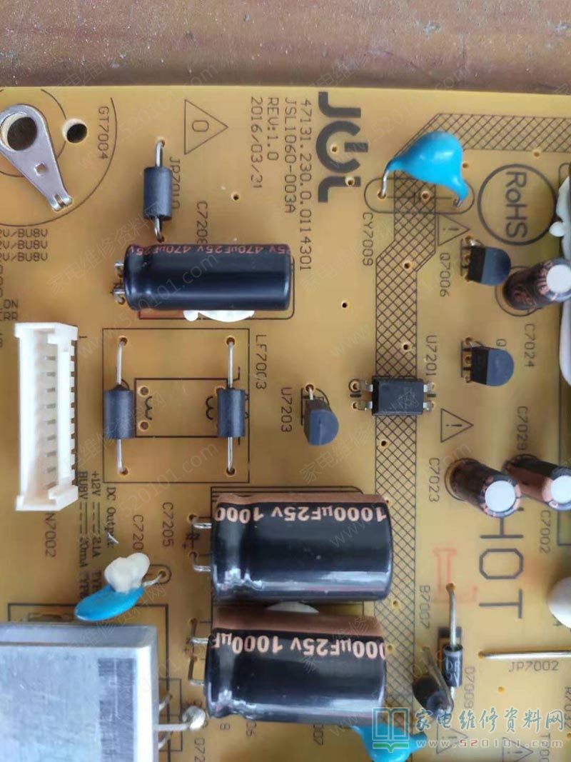 接修一台夏普LCD-40A35A液晶电视,电源背光二合一板JSL1060-003A电源部分烧炸了,进口机器我手里没有图纸就摸索着修,U7002芯片是6脚印丝为R2N,激励输出上面电阻烧了看不清楚,查出共烧了8支元件,U7002、Q7002、R7026、R7027、R7030、D7015、R7032、C7022。手中没有R2N,跑电路分析用7535替R2N,换上损坏元件开机电源正常,但是机器工作几分钟功率管十分烫手,怀疑7535换得不好,之后分别用1251和2263替换仍旧高烧不退,反复调整激励输出电阻仍旧。最后发现是C7022(221/1KV)换的不好,手中没221了就用471/1KV二支串替代。从早上8点试机到12点手摸功率管散热片温微热偏高点。
