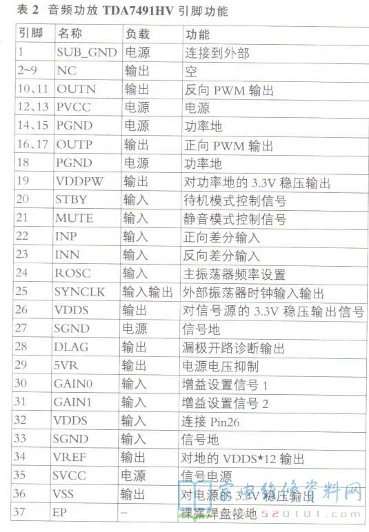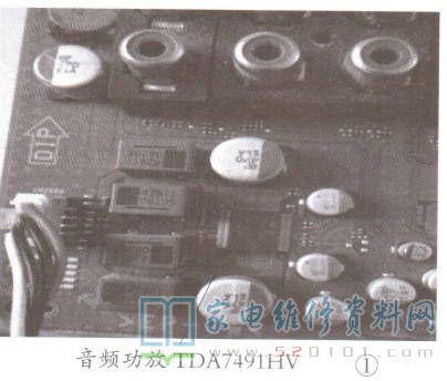 上电,测量音频电路供电,发现在开机瞬间15V电压正常,噪音增大后该电压迅速降为0V。断开电源板的负载,将一只1k电阻跨接在电源板上的"POWER -ON” 脚与“STBY3.3V"脚之间后强制开机,上电,测得各路输出电压正常且稳定,由此判定音频电路有故障。该机功放采用D类音频放大器TDA7491HV ,如图1所示。