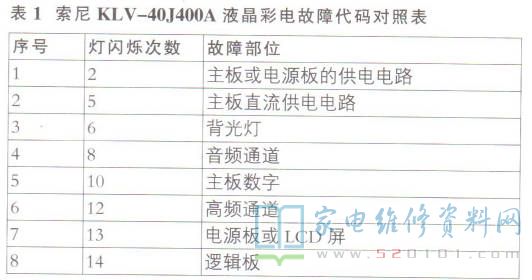 接修一台索尼KLV-40J400A型液晶彩电,开机后图像正常,但伴音中有噪音,约2s后噪音突然变大,随即声像全无,此时电源指示灯闪烁8次后停2s再闪8次,如此反复。首先查看该机的故障代码表(见表1),得知故障部位在音频通道中。