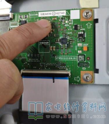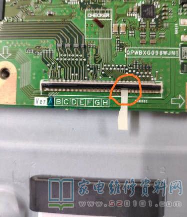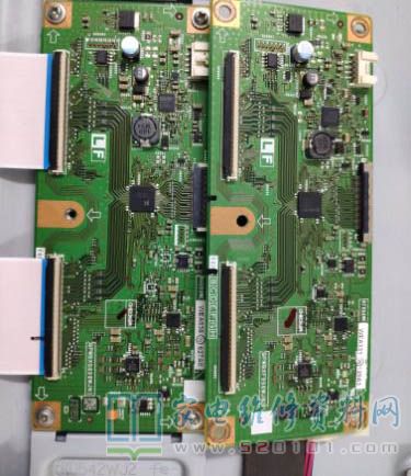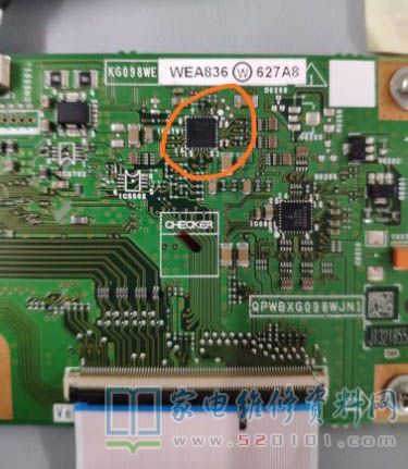 接修一台夏普LCD-46LⅩ440A液晶电视,故障表现为闪屏,就是在正常的图像下,隔一二秒,从图像上面1/3处,上下拉开白屏闪一下,很刺眼,像闪电一样,手头有一块46LX450A的逻辑板,看着接口相同,就代换了一下,事实证明,这两个逻辑板是通用的,但故障依旧,半屏试机,左半屏还是闪屏,而右半屏是正常的,同时发现逻辑板上一芯片发烫(图5中打圈的那个)屏一工作马上就发烫的那种,判断屏边板或者屏内有漏电或短路,屏内就不说了。
