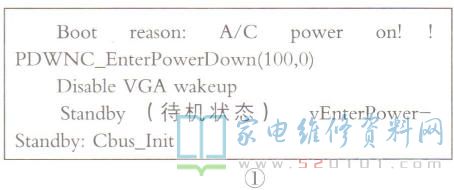 该机是4K高清机,除主板外,还有一块变频板和一块逻辑板。从故障现象看,主板已经启动成功并且正常工作,出故障的可能性比较小。该机主板上有一个服务专用接口,外形与立体声耳机插座一样。 插入三芯插头,用指针式万用表测两根芯线和外壳(即地线)间有6k电阻,估计该接口是升级端口。连接USB转TTL刷机小板,打开Secure CRT软件,上电后查看该机打印信息。无论是正常状态还是出现黑屏故障,打印信息中均出现如图1所示的字符,提示电视机处于上电待机状态。