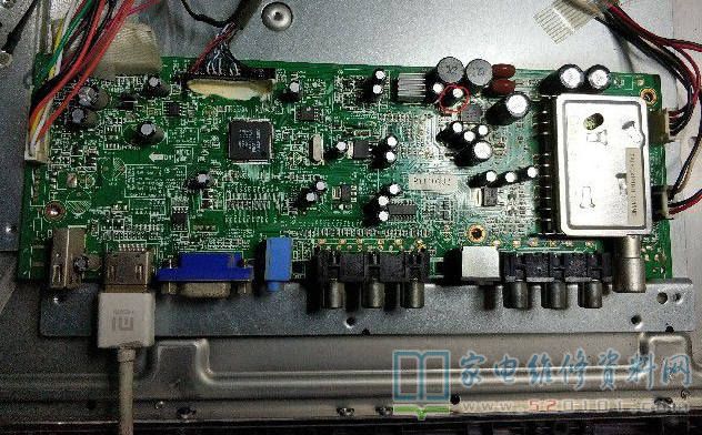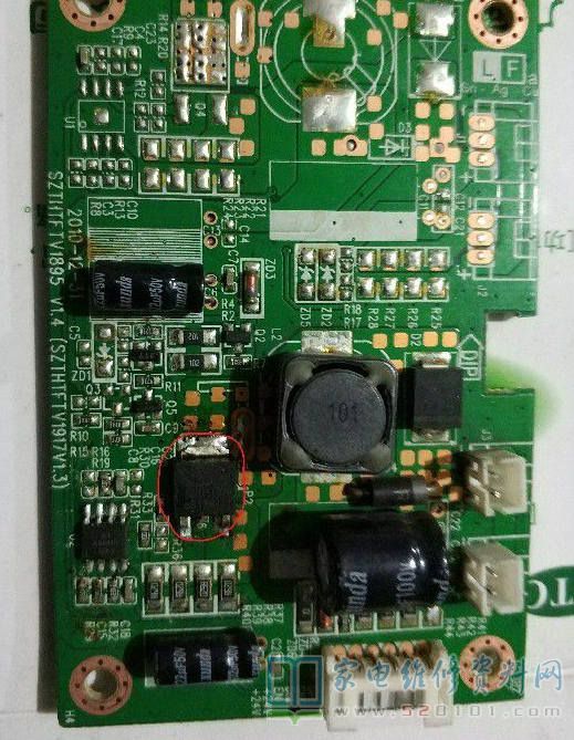 接修一台三洋32CE750LED液晶电视,故障表现为开机不定时黑屏,有声音,声音伴有嘟嘟声,开机检查LED恒流板上的STU15L01发热烫手,怀疑损坏,因没有原零件,故换上替代恒流板,黑屏故障解决。声音还是嘟嘟响,试机10分钟后杂音渐渐消失,分析应该是电容滤波不良,用电容并联法试机,主板音频功放旁边一电解电容杂音消失,取下测量只有3.6uF(原机10uF/25v,零件位置图片已标注),换后声音正常。