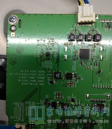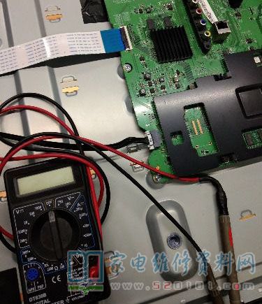 最后查到两个保险烧掉。换上保险后测得供电电压是1V左右。连接屏线,电视显示正常,故障修复。