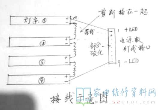 接修一台三星UE48J5000液晶电视,故障表现为开机黑屏有声,初步估计是灯条问题。打开后盖,正准备开屏,却看见电源板上面灯接口已经烧黑碳化,有几条线已经焦化。测屏里面引出的8条线,分别是四组灯条,用灯条测试仪都可以点亮。观察接口电路,1脚接LED+,9脚LED-,其余几条线串联在一起。清理电源板碳化部分,这个至关重要,如果碳化的电路板漏电会引起功耗增加甚至保护。然后剪断八条灯线,1和8分别焊在电路板上面的LED+和LED-,其余6条分三组按原电路顺序焊接起来,并套上热缩管以绝缘。接好开机,屏幕亮起,图像正常。