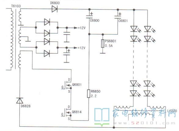主电源开关变压器T6103灯条供电绕组产生的感应电压经D6800整流,C6800、C6801滤波后得到灯条供电送给两路灯条,通过互感器L6800及D6826、Q6801、Q6814、R6850、PS6801到地形成回路。经检测0.5A保险电阻PS6801已开路。更换PS6801后试机,故障排除。