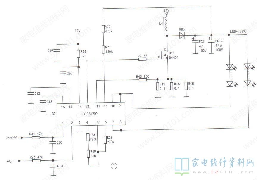 三洋32CE560液晶电视机,笔者根据实物画出了该机背光电路原理图,如图1所示。由于贴片电容实物上没有标注容量,所以图中的贴片电容也没有标注容量,供大家维修时参考。该机背光电路由控制芯片IC2( OB3362RP)、储能电感L4、升压二极管DB5、滤波电容EC7和EC13开关管Q11等元件组成。