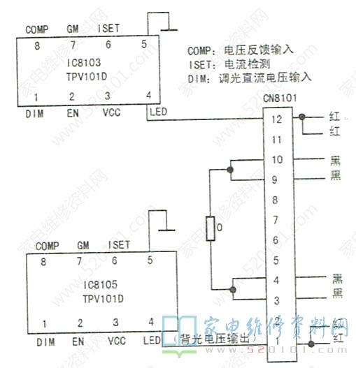 接修一台飞利浦40PFL3240/T3型液晶彩电,开机后屏上出现暗光,随即黑屏;一会儿后又出现暗光,很快又黑屏,如此反复。该机背光输出插座为CN8101,输出两组灯条电压,如图1所示。上电,测得②脚与①脚之间有42V电压,但很快降至27V,随后又降至1V。拔出CN8101插头开机,输入AV信号,用点灯器测得①、③脚电压为22.3V,①、④脚电压为24.4V,12、9脚电压为17.5V,12、10脚电压为24.6V。