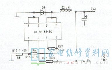 提示:DC-DC转换芯片型号很多,代换时除了要注意引脚功能外,还要注意最大输出电流以及输入电压范围是否满足要求。另外,芯片的取样反馈FB脚电压要一样。否则,需要调整取祥电阻才能得到需要的输出电压。AP1510与AP1534的FB电压均为0.8V,输出电压V=0.8(1 +RA/RB)。 本例中RA为4.7k,RB为1.47k,输出电压为3.36V。