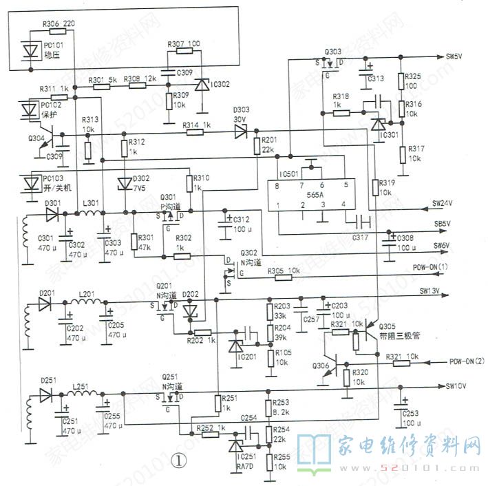 C309和R307是防止IC302发生振荡而设置的阻尼电路。当IC302的R极电压达到2.5V时导通,流过光耦PC101发光管的电流增加,电源初级振荡频率降低,以稳定输出电压。6V电压分三路:一路送IC501的⑤脚和⑧脚。IC501是一块贴片8脚芯片,是一块低压差5V稳压块。由于输入、输出电压差只有1V,故用普通的7805是不能正常工作的。IC501 的①脚输出SB5V电压,这个电压上电就有。另一路接Q301的S极。Q301是P沟道管,G .极接Q302。当主板发出POW-ON(1)信号为高电平时,Q302导通,Q301因G极为低电平导通,输出SW6V(SW指经过开关控制的输出电压)。还有一路接由Q303和IC301组成的5V稳压器。Q303是一个N沟道管,其G极除受IC301控制外,还受Q305控制。只有当主板输出的.POW-ON(2)信号是高电平时,Q306导通,Q305因b极为低电位也导通。因为Q303的G极电压须高于S极3V以上才能导通,所以Q305的e极接D251输出的15V电压,这一路输出SW5V电压。R325R316、R317是取样和分压电阻,由IC301进行稳压控制,C313是消振电容。