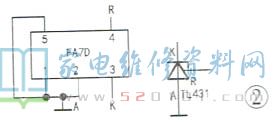 D301 输出的6V电压经R301、R308和R309分压后,接IC302的R极.IC302是一块贴片5脚芯片,丝印型号是FA7D (IC201、IC251以及IC301均为FA7D)。从引脚接法以及功能来看,应该等同于常用的三端稳压芯片TL431,如图2所示。