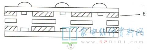 A、B塑料薄膜上均印刷有碳粉导电膜触点D,并在A、B之间隔有一层带孔的塑料薄膜C。长期使用后,A、B膜上的触点D易粘连,使得按键板输出电压异常,引起本机故障。由于该按键板价格太高,所以笔者按以下简易方法作应急维修:在A.B两层塑料薄膜的内侧粘上不干胶带E(可以用双面胶带并且保留背纸),以增加触点D之间的距离,如图2所示。