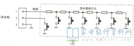 拔下按键板与主板的连接排线,测量按键板插座①、②脚之间有十几兆欧不稳定的漏电电阻。用电子清洁剂将碳膜清洗干净后再测,电阻变为无穷大。通电试机,故障排除。