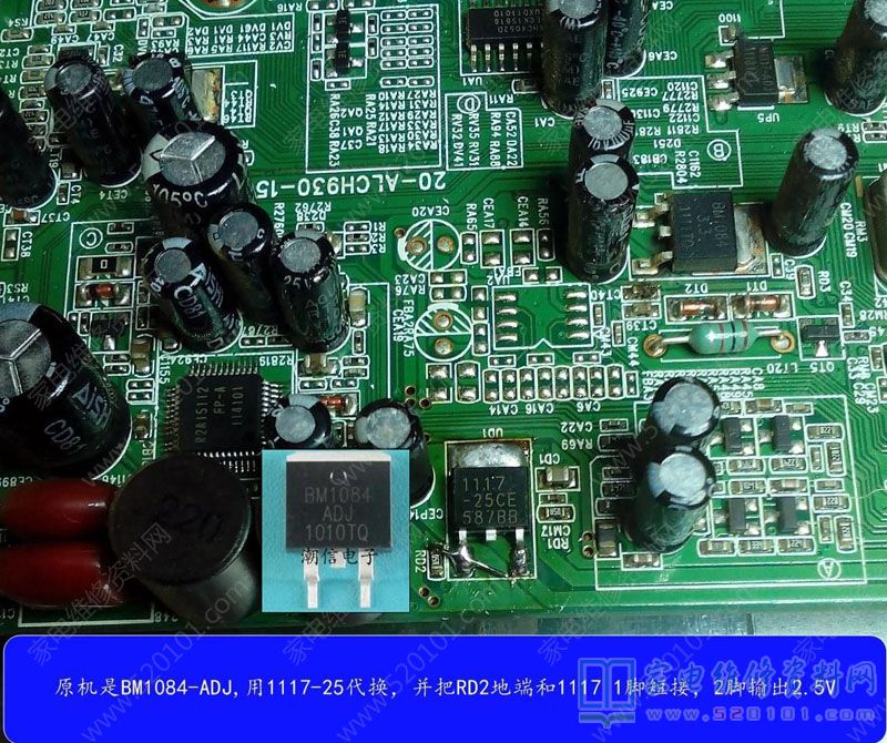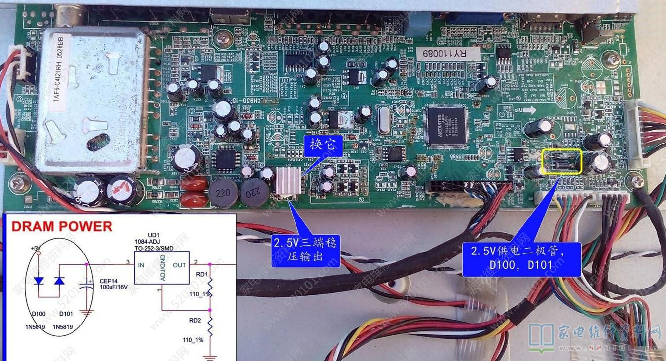 接修一台三洋LCD-32CA760液晶电视,故障表现为有时候能开机,但是开机后别关机,关机再开机就开不开了,不是卡在LOGO哪里不动,就是开机蓝灯亮背光不亮,要不就是开机后灰屏背光亮无图像,在这些现象中按键遥控器都不管用,就和死机一样,测量电压都正常,数据也重新写和主板也加焊均无效。最后请教同行之后,按照他的维修方法,如下图所示,把2.5V三段稳压器更换掉,2.5V供电二极管D100、D101更换掉,原机是BM1084-ADJ,用1117-25代换,并把RD2地端和1117 1脚短接,2脚输出2.5V即可修复此故障。此二次不开机为该机型通病故障。