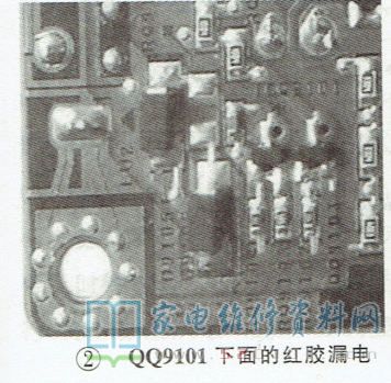 当主板接收到遥控或键控开机信号后, POW-ON信号变为高电平,QM852.QM855导通,输出B13V电压;QM854因G极为高电平而导通输出B5V电压,主板得到这两个电压后进入开机状态,待全部检测正常后,CPU发出高电平BL-ON信号,Q9701导通,通过D9104B和R9703使Q9104导通,给背光芯片SEM5025的①脚提供工作电源,使背光点亮。Q9701的c极接有一只二极管D9104A,该二极管正端接有保护电路。本机故障的原因很可能是该保护电路误动作。QQ9101(贴片PNP三极管)的e极接背光供电(如图2所示),电压较高是否因漏电引起误保护呢?拆下QQ9101,发现线路板上的红胶有异样清除干净后再涂上704胶,最后装上QQ9101,开机,故障排除(这说明故障确实是由于线路板漏电引起的)。