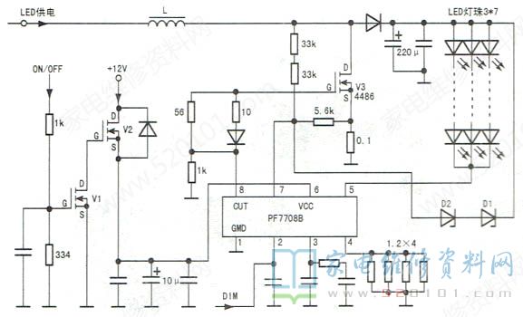 二次开机后,ON信号为高电平,场效应管V1、V2相继导通,+12V送到PF7708B的⑥脚(VCC端),⑧脚输出推动信号,推动场效应管V3工作于开关状态。V3导通时,电感L储能;V3截止时,电感L的感应电压与LED供电叠加,供给LED灯条。