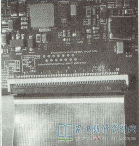 根据经验,高电压电路的故障率要高一些,怀疑排线49脚或51脚对应的屏体电路有问题。试着割断逻辑板上的51脚引线(因为线路细小密集,需要用缝衣针在放大镜下小心地操作),再插上右边排线开机,整屏图像完全正常。目前该机至今已使用半月有余仍正常。