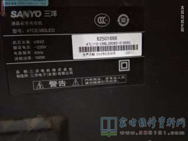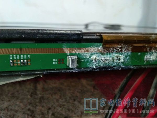接修一台三洋47CE380LED液晶电视,故障表现为进水后灰屏,该机采用LG高分屏,型号是LC470EUN(SD)(F1),测量VGH无电,断开左边上屏排线出现半屏图像VGH电压恢复正常,由此断定为屏坏,拆开屏发现边板严重水侵,清洗干净发现R125/5.6K和R127/68K电阻无穷的大,C112/10UF电容短路,更换上述原件,整机恢复正常。