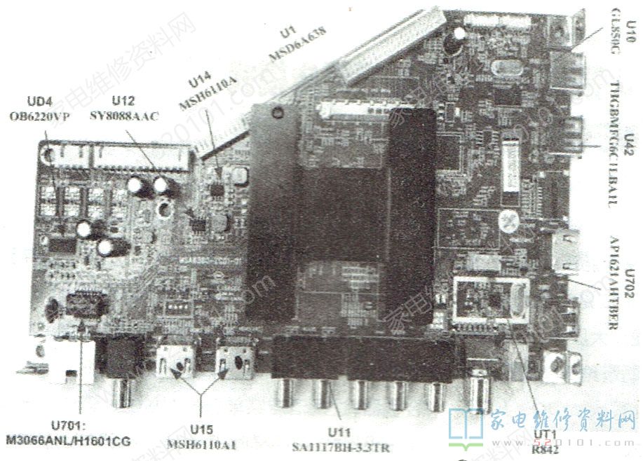 接修一台三洋48CE3410D型液晶彩电(MSD6A638机芯),上电后指示灯亮,不开机。该机主芯片U1采用Mstar公司生产的MSD6A638JSMG-8-Y8,搭载Android4.4操作系统,主板上的主要IC如图1所示。