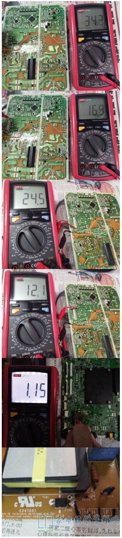 下一步就着手检查电源部分了,发现电源板标识该路电压的确是24V,实测34.3V,另一路标识为12V的电压也升高到了16.9V,检查电源的稳压部分,发现光耦已腐蚀断脚,更换光耦后输出电压恢复至24.5V,12.1V正常值,换上STA380BW,开机图声正常,顺便测量下输出端4个电感的对地电压都为1V左右,至此,电视机无声音故障修复。