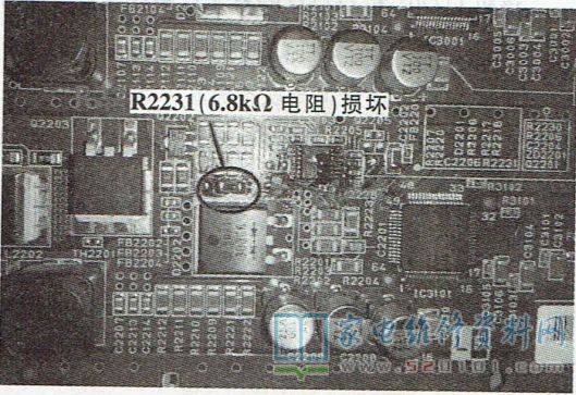实测Q2203、Q2204的G极电压为33.22V,D极电压为24.1V (正常应为26.03V),s极电压为36.80V,经查R2231阻值变大为16.3k,如图2所示。更换R2231后,Q2203、Q2204的D极输出电压恢复为26.03V。再次进入工厂菜单,将保护记录清除后长时间试机,一切正常。