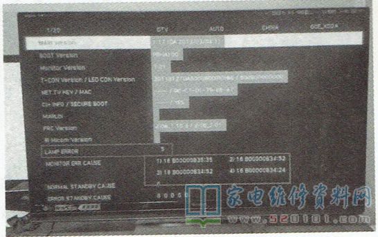 接修一台夏普LCD-60X50A液晶电视,故障表现为开机后无光栅、无伴音。先进入工厂维修状态查看是否有保护记录,发现有保护记录,如图1所示,保护代码“16”为LAMP异常。拆开机器后再次强制开机进入维修模式,测量背光板上的8组LED供电电压,发现一组输出电压为24.1V,低于正常值26.03V。电源板输出的+36V电压经过R2207、R2220 (两只并联,阻值均为1.8k)与R2218、R2217、R2208(三只并联,阻值均为6.8k)分压,再经R2231(6.8k)送到调整管Q2202的b极,该电压为33.02V (正常应为35.14V),其c极电压为36.80V,e极电压为33.41V(正常应为35.15V),经R215、R214、R213 (三只并联,阻值为220)分压后再分别送入R2224、R2225电阻分压,再分别送入MOS调整管Q2203、Q2204调整出26.03V为屏内部灯带LED灯珠提供导通电压。