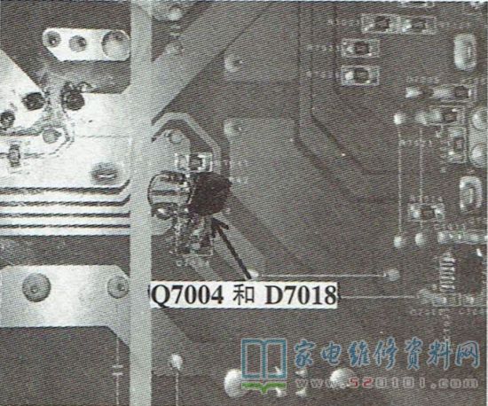 继续检测,发现电源板反面的贴片三极管Q7004( 1AM)和贴片二极管D7018(无法看清型号)都已击穿。因手头没有同型号元件,用常用的三极管8050代换Q7004,用二极管1N4148代换D7018,并将其焊在相应的焊盘上,如图1所示。再次开机,C7017两脚电压升至380V,+5V和+12V电压正常,声图俱佳,故障排除。