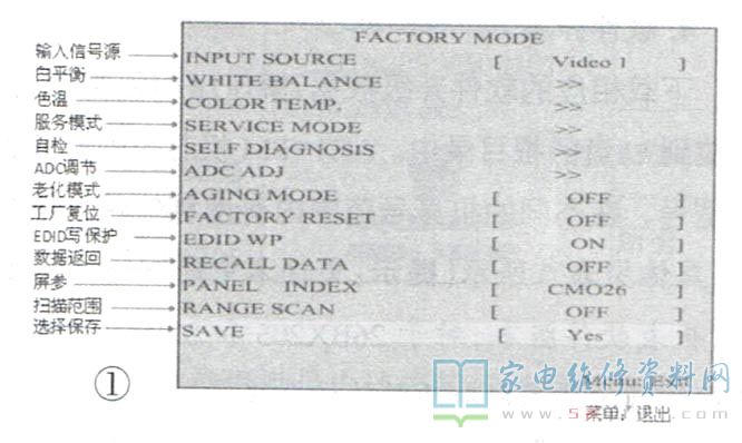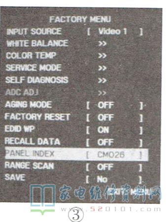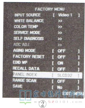 接通主电源开关,在待机模式下,依次快速按遥控器(型号:RM-SA020)上的“屏显”、数字“5”、“音量+”、“电视电源"键即可进入工厂模式,遥控关机退出。遥控器上的“上、下、左、右”键调节项目和改变数值,“音量+”键确认,调节项目如图1所示。提示:更换屏或主板后,需要进入维修模式调整相关数据,获得最佳的白平衡和GAMMA参数。PANEL INDEX(屏参设置),如图2、图3所示。