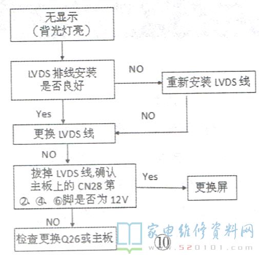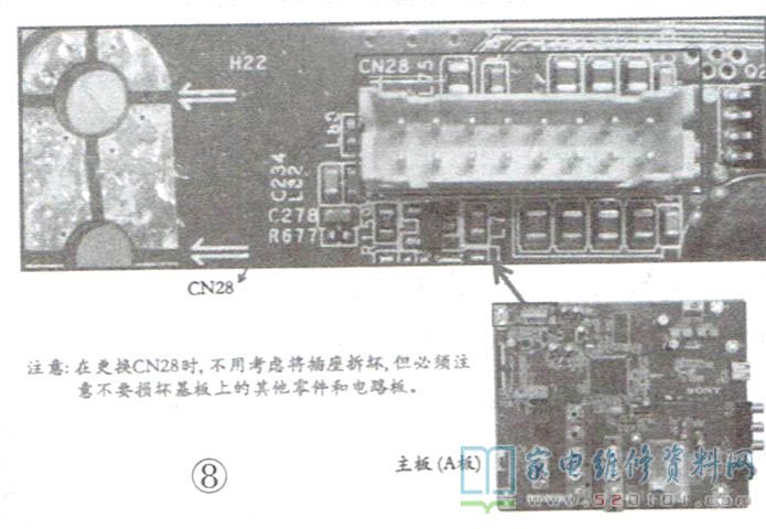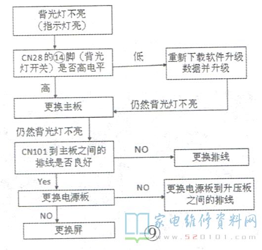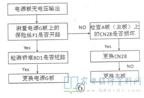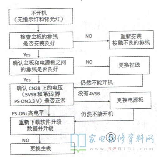 不开机的检修流程如图5所示。无电压输出的故障检修流程如图6所示(BD1与F1的实物如图7所示,CN28的实物及更换技巧如图8所示,引脚功能及参考电压见表2所示)。背光不亮的检修如图9所示(注意在拆装Q26时,不要损坏基板.上的其他元件)。
