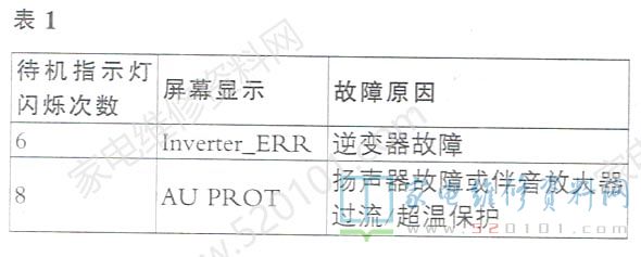 在待机模式下,依次快速按遥控器上的“屏显”->数字“5”->“音量-”->“电视电源"键即可进入,遥控关机退出。待机时,红色指示灯闪烁次数表示进入故障自检模式(每停顿2s间隔后计算待机指示灯的闪烁次数),详见表1所示。