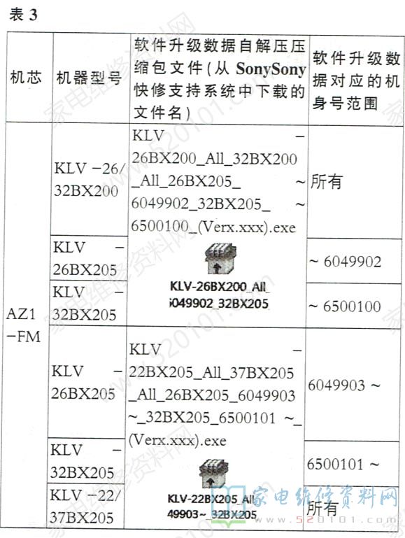 下载相应的软件升级数据,解压压缩包文件,并存放到U盘的根目录中。AZ1-FM机芯中的部分整机型号,在不同的机身号范围内有两种软件升级文件,具体见表3所示(提示:文件名中的“x.xx"为数字,代表软件版本,对于26BX205和32BX205在不同的机身号范围内有两种软件升级数据文件)。