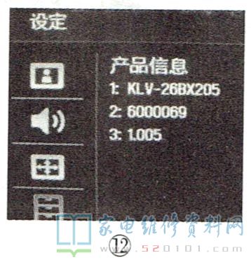 然后打开用户菜单(方法:选择“用户菜单→设定一产品信息”),如图12所示,确认软件版本,确定机器是否要升级(以KIV -26BX205为例,该机的软件版本是1.003)。