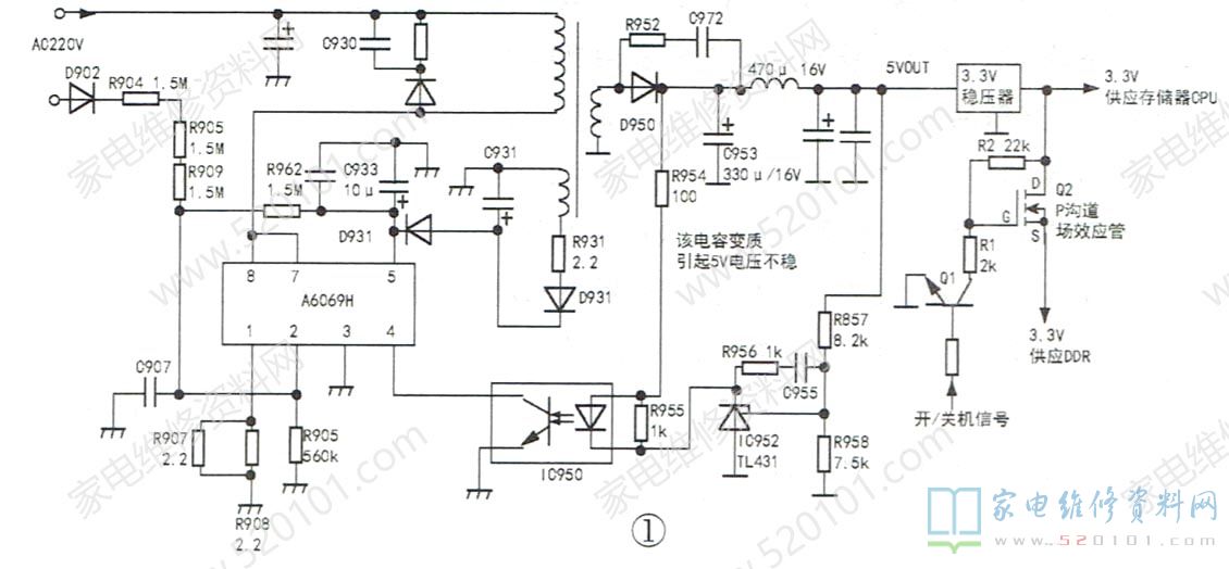 先测副电源5V正常,二次开机后主电源输出的12V、24V电压一直很稳定,PFC电压为390V。给背光ON/OFF端外接3V电压,背光稳定点亮,这说明背光部分正常,难道存储器数据损坏?测25Q32的⑧脚电压,待机时为3.3V(正常),但开机后电压下降到2.7V且不稳定。该电压是由副电源5V经3.3V稳压后得到,如图1所示。再测副电源5V,发现待机时5V电压很稳定,但开机后跌至3.7V且不稳定。用示波器测D950负极竟有周期为20us 3.4Vp-p 的脉冲,显然C953有问题,拆下来测充放电正常,外观也完全正常。换新后开机,故障排除。为什么原电容用万用表测充放电正常,但实际已失效了呢?电解电容是用二片极薄的铝箔中间夹.-张绝缘纸卷绕而成,引出线是铜线,如果铝箔和铜线接触电阻过大,用万用表测充放电时电流很小,看不出异样,但在高频大电流下等效电阻大大增加,失去滤波作用。