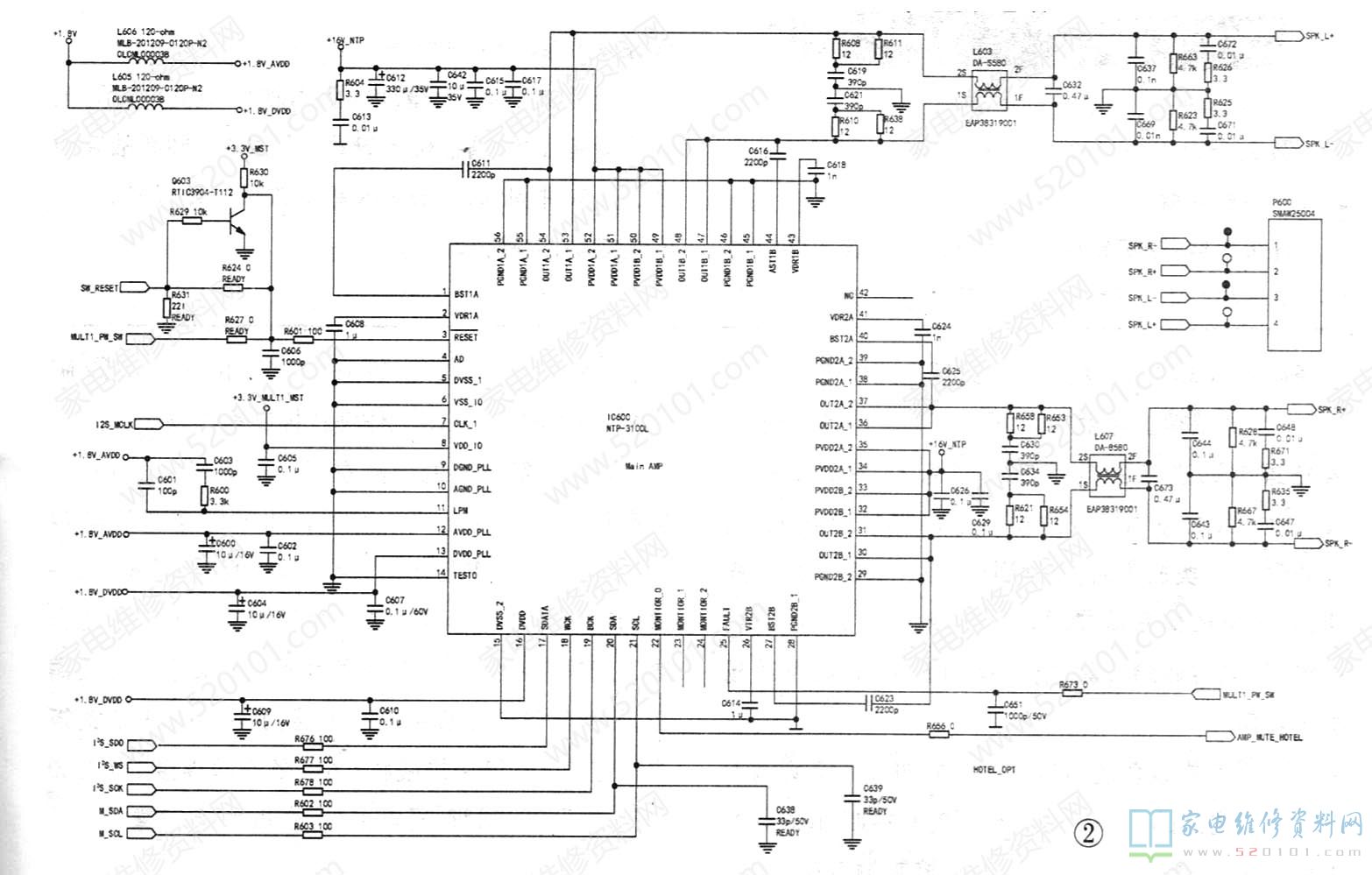 NTP-3100L是D类双声道音频功率放大电路,内置放大电路、脉宽调制电路数字功放电路。开关电源输出的+16V-NTP电压为IC600的32~35脚内部右声道功放电路供电,同时为49~52起脚内部左声道功放电路供电。DC-DC转换电路输出的+3.3V -MULTI-MST为⑧脚内部IO电路供电,+1.8V-AVDD、+1.8V-DVDD为12、13脚内部的PLL电路以及16脚内部的数字信号处理电路供电。IC600获得上述供电后,启动工作。前置音频信号处理电路送来的数字音频信号I2C-SDO、I2C-WS、I2C-SCK从IC600的17~19脚输入,经过IC内部处理及D类放大后,右声道信号从30、31、36、37脚输出,左声道信号从47、48、53、54脚输出,经过外部的电感、电容滤除高频成分,得到音频信号,推动扬声器发声。主板的总线系统通过IC600的20、21、7脚输入对IC600内部的工作状态进行调整和控制。IC600的22脚(MONTIOR _0)是旅馆模式控制输入端,放大器的静音控制通过22脚实现,IC600的25脚(FAULT)是功放电路工作模式控制输入端。